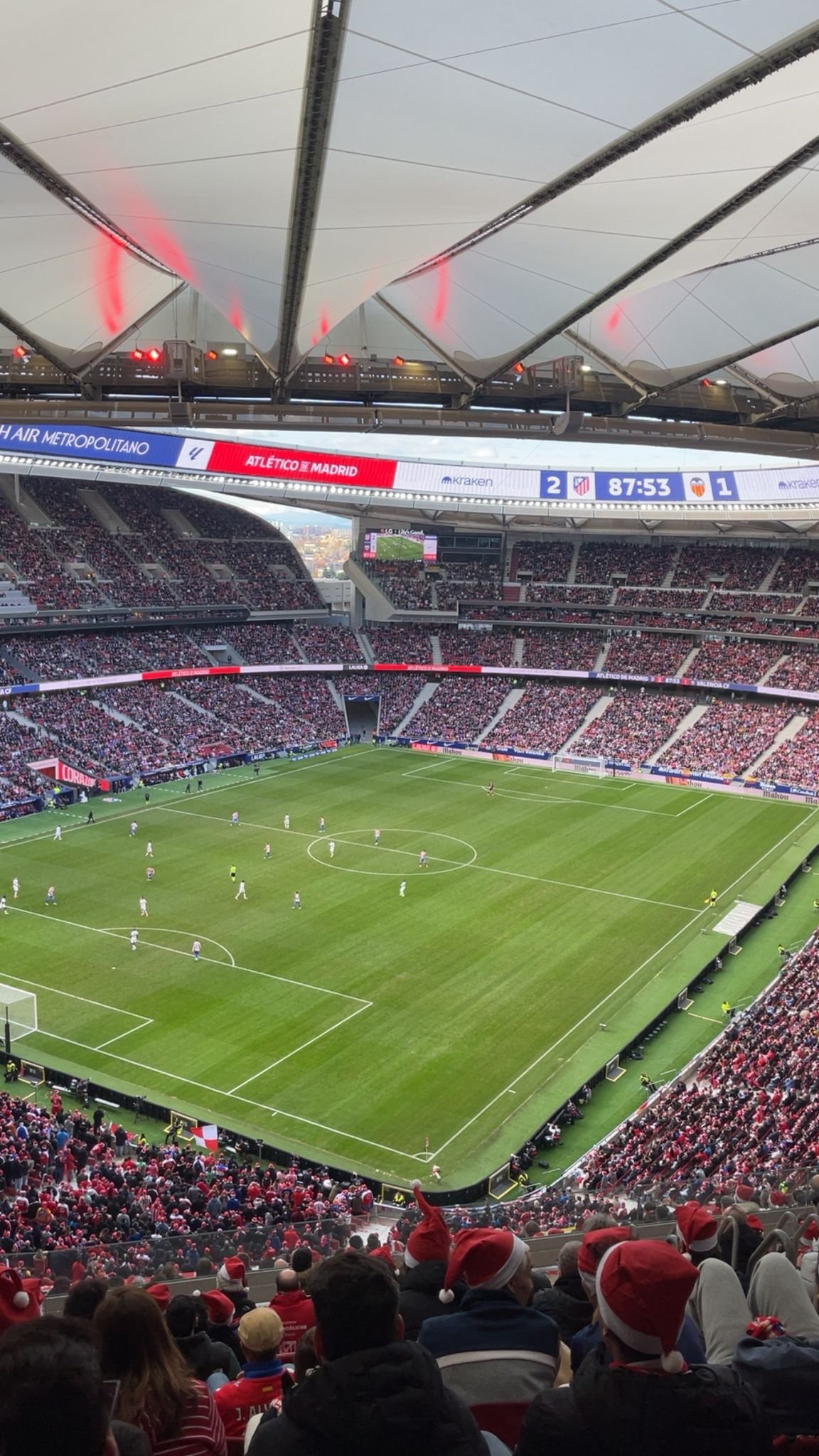 Anyway, enough about the away team. I quickly jumped on the subway. Thanks to the excellent Madrid subway connection, it’s a short trip from where I live to the beautiful Metropolitano. Just take line 4 at Serrano, change to line 7 at the Avenida de América subway station, and you’ll soon find yourself in great football atmosphere. I attended the match with a fellow student, which is always nice to do with a great expert. After a quick bite to eat before the game at the stadium, we were in our seats just in time. Right at the top of the stadium, but for the price I paid for the ticket, you certainly can’t complain. Incidentally, because it was Atlético’s last home match in 2025, all supporters were treated to a red Christmas hat. The whole stadium was transformed into a real Christmas atmosphere because everyone was wearing their hats, even though it was still about two weeks until Christmas.